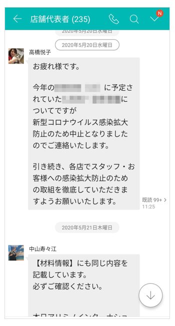 本社と店舗・スタッフ間の情報共有、契約書や注文書などの書類のやりとりに加え、オーナーや美容スタッフ同士の業務連絡も「LINE WORKS」に一本化。従来のFAXや電話に比べてスムーズな情報共有が可能になり、シャドーITの防止にも寄与しています。複数の機能を使い分けており、本社からの連絡においては、店長やオーナーへの連絡には「トーク」、約1,500人のスタッフへの一斉連絡は「掲示板」を活用。コロナ禍における店舗休業時には、スタッフのメンタルケアを目的として「アンケート」を使ったコミュニケーションも行いました。