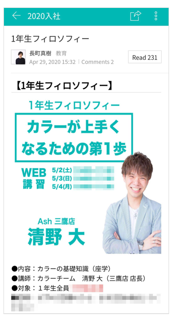 4月の緊急事態宣言を受けて全店を休業し、約200名の新入社員をはじめとする、若手社員(美容師)への教育をオンライン化しました。社内でも特に技術力の高い美容師がシャンプーやヘアカットなどの教材動画を撮影し、「LINE WORKS」の「掲示板」で共有。動画を視聴した新人・若手社員も実演動画をアップロードし、アドバイスを受けながら技術を磨いています。なお、休業期間における動画の総再生時間は約1,000時間を超えました。