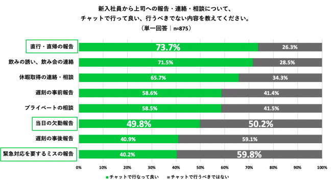 新入社員から上司への報告・連絡・相談において、チャットで行って良い内容・行うべきではない内容について質問をしたところ、チャットで行って良い内容として最も多い回答は「直行・直帰の報告」(73.7%がチャットでOK)、チャットで行うべきではない内容として最も多い回答は「緊急対応を要するミスの報告」(59.8%がチャットはNG)となりました。