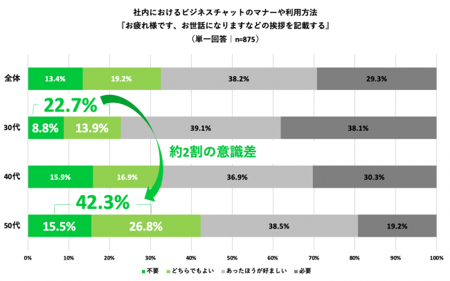 2.社内チャットで「お疲れ様です・お世話になります」などの挨拶の必要性、「不要・どちらでもよい」と回答した50代は42.3%、30代は22.7%にとどまり約2割の意識差