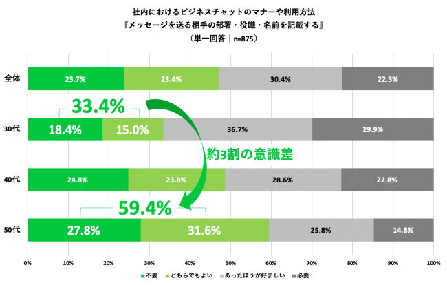 「不要・どちらでもよい」と回答した50代は42.3%、30代は22.7%にとどまる3. 社内チャットでメッセージ相手の「部署・役職・名前」記載の必要性、