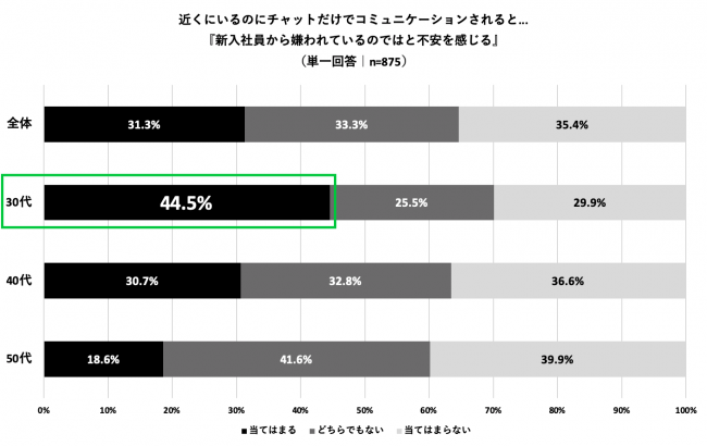 新入社員が、近くにいるのにチャットだけでコミュニケーションを取ると、30代は50代の2倍以上「新入社員から嫌われているのではないか」と不安を感じる傾向が強いことがわかりました。