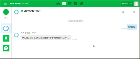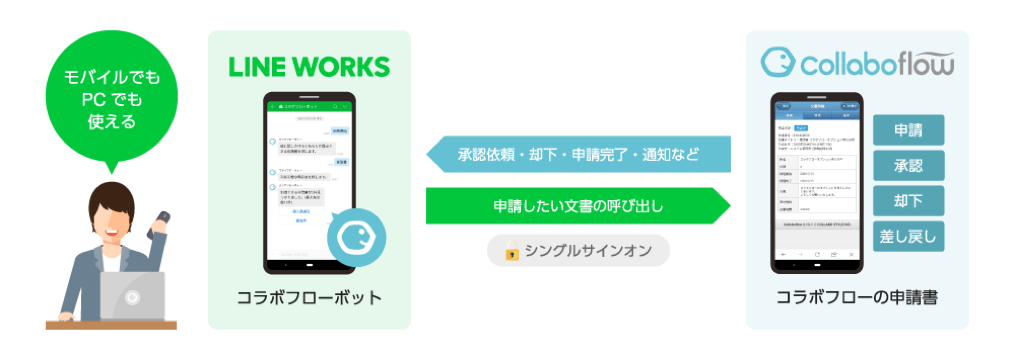この度の連携により、申請書類の作成者は「コラボフロー」内に格納されている申請書類フォーマットを「LINE WORKS」のトーク上でチャットボットに問いかけることで検索できるようになります。また、決裁者に対し「コラボフロー」で申請書類を提出すると、決裁者の「LINE WORKS」のトーク上に承認依頼通知が届くようになります。決裁者は、「LINE WORKS」から「コラボフロー」に遷移し、簡単に申請書類の閲覧が可能です。