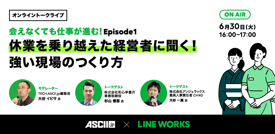 ビジネス版LINE「LINE WORKS」を提供するワークスモバイルジャパン株式会社(本社:東京都渋谷区、代表取締役社長:石黒 豊、以下 ワークスモバイルジャパン)は、6月30日、オンライントークイベント「会えなくても仕事が進む Episode1 休業を乗り越えた経営者に聞く、強い現場のつくり方」を開催いたしました。オンラインで開催した本イベントの内容と登壇者のコメントを一部抜粋してご報告いたします。