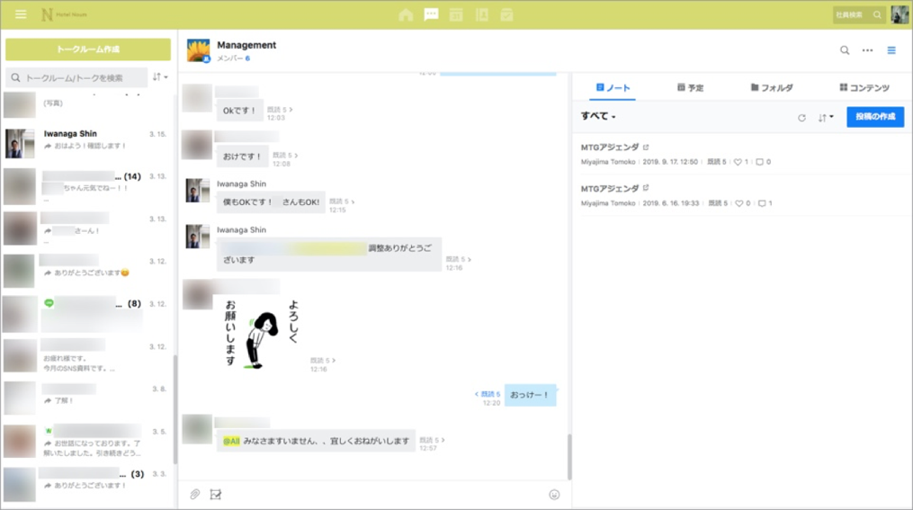 Noumでは、スタッフ25名がフロント業務、全50室の客室清掃・メンテナンス業務を行っています。従来はSNSのグループ機能を社内コミュニケーションに活用していましたが、仕事とプライベートを切り分けたいというスタッフの要望がありました。