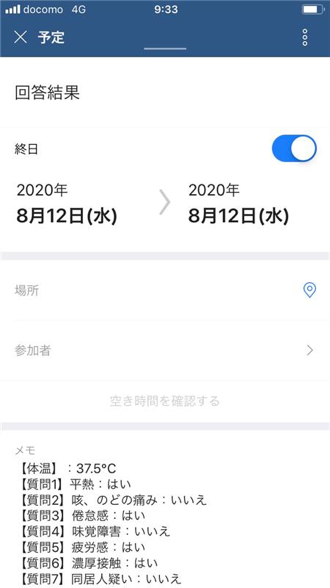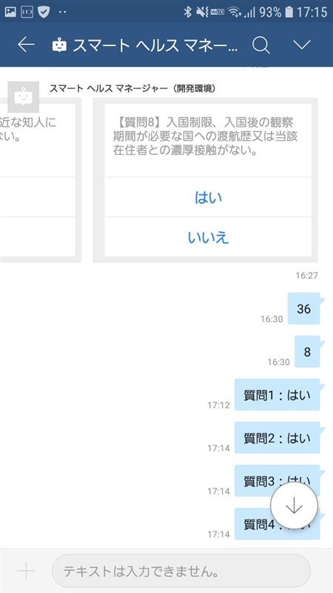 チャットボットが表示する体温チェックと8つの質問(体調チェック項目)に対して、選択肢から回答をタッチするだけで記録できます。
