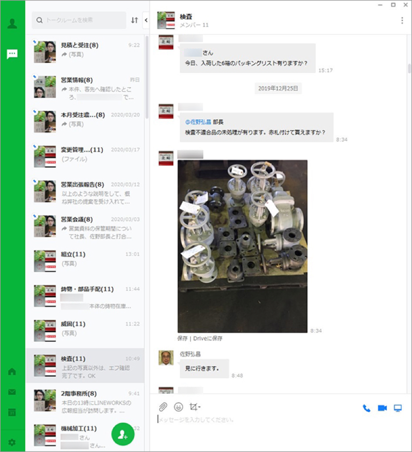 「組み立て」「鋳物部品手配」「検査」「機械加工」「見積もりと受注」など目的に応じたグループトークを作成。一番活発に利用されている「検査」というグループトークでは、毎日集荷前の検査、工場からの製品の受入検査、水圧検査など、さまざまな検査結果が投稿され、検査中の動画や問題箇所の写真など、写真と動画の両方を活用した報告が行われています。また、完成した製品の検査の判定では、写真共有やメンション機能を活用し、即座に他の社員の判断を仰ぐことができます。これらのことから、現在の検査に要する時間は、従来の半分以下に削減できており、作業効率化に貢献しております。
