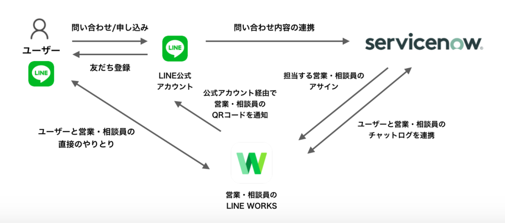 本ソリューションモデルでは、まず、顧客や住民などの相談者が、自身の「LINE」アカウントから企業や各種団体が開設した「LINE」の公式アカウントへ問い合わせを行うと、「ServiceNow Customer Service Management」のチャットボットが相談内容を聞き出し、自動的に問い合わせチケットを作成し、相談担当者をアサインします。次に、アサインされた相談担当者の「LINE WORKS」アカウントへ問い合わせ・相談内容が通知されます。担当者及び監督者は、自身の「LINE WORKS」アカウントと相談者の「LINE」アカウントがつながるグループトークで問題解決に向けたコミュニケーションを行います。