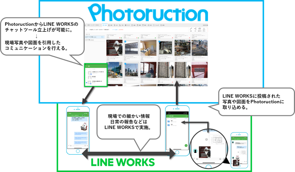 このような状況を踏まえ、50,000件以上の工事現場で利用されている「Photoruction」と多くの建設関連企業で情報共有のコミュニケーションツールに利用されている「LINE WORKS」を提供する、フォトラクションとワークスモバイルジャパンは、建設業界のテレワーク課題の解決及び生産性向上を目的に協業をいたします。