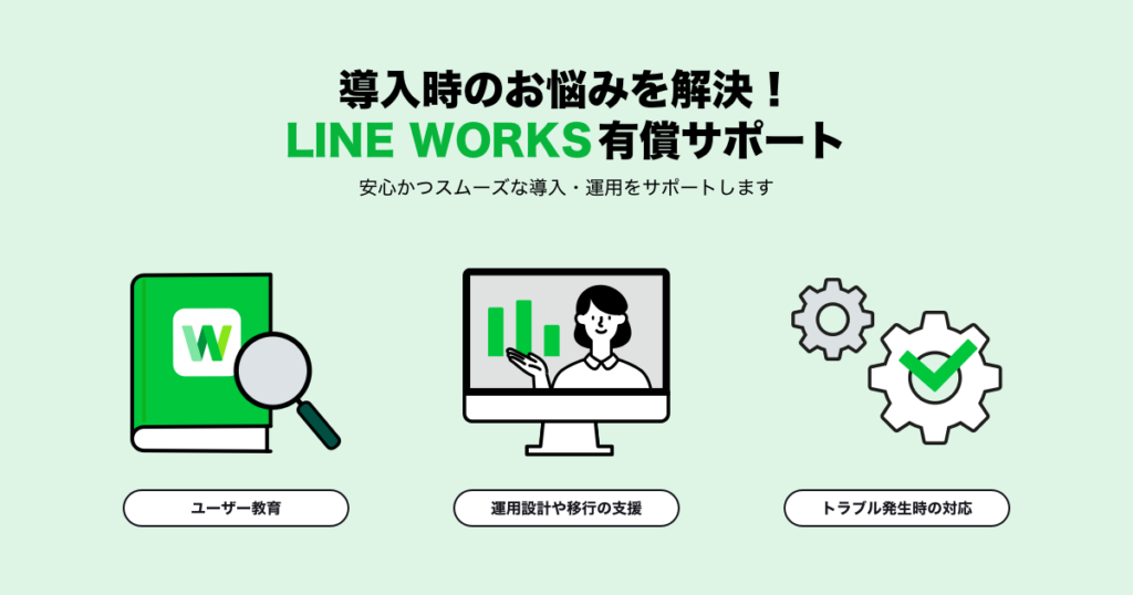 そういったご要望にお応えし、「ユーザートレーニング」「導入支援サービス」「導入後有償サポート」の3つのメニューからなる「LINE WORKS有償サポート」の提供を開始いたしました。