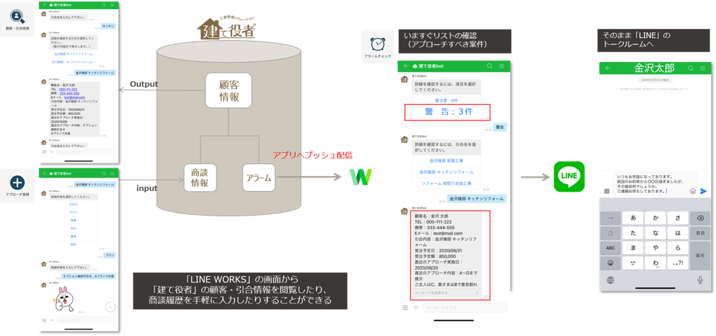 アプローチすべき案件が「建て役者」から「LINE WORKS」にプッシュ通知され、そのままLINEのトークルームからメッセージ送信が可能。営業担当者は「LINE WORKS」でアラームを確認しそのままLINEまたは「LINE WORKS」で顧客へのアプローチができます。