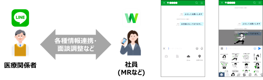 「LINE WORKS」は、コミュニケーションアプリ「LINE」とつながる唯一のビジネスコミュニケーションツールです。ノバルティス ファーマでは、チャットでのやりとりを希望する医師などの医療関係者のニーズに応えるため、MRを含む社員に「LINE WORKS」を導入。社員の「LINE WORKS」アカウントと医療関係者のLINEアカウントがつながることで、医療関係者は日常的に利用しているLINEを活用してMRなどの社員とコミュニケーションが可能となり、円滑で迅速な情報共有や問い合わせ対応などの実現につなげていきます。
