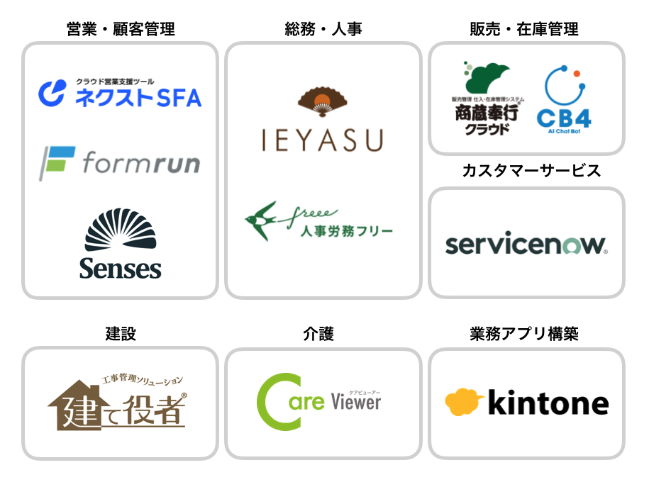 「LINE WORKS」と連携するソリューションには、さまざまな業界や業種の中で、すでに浸透している著名な製品やサービスが多く存在しています。これらの製品やサービスが「LINE WORKS」と連携し、「LINE WORKS」のインターフェイスを通じて利用することで、ITツールに馴染みのない人たちにも簡単に使えるようになったり、業務効率の向上に活かせるようになっています。