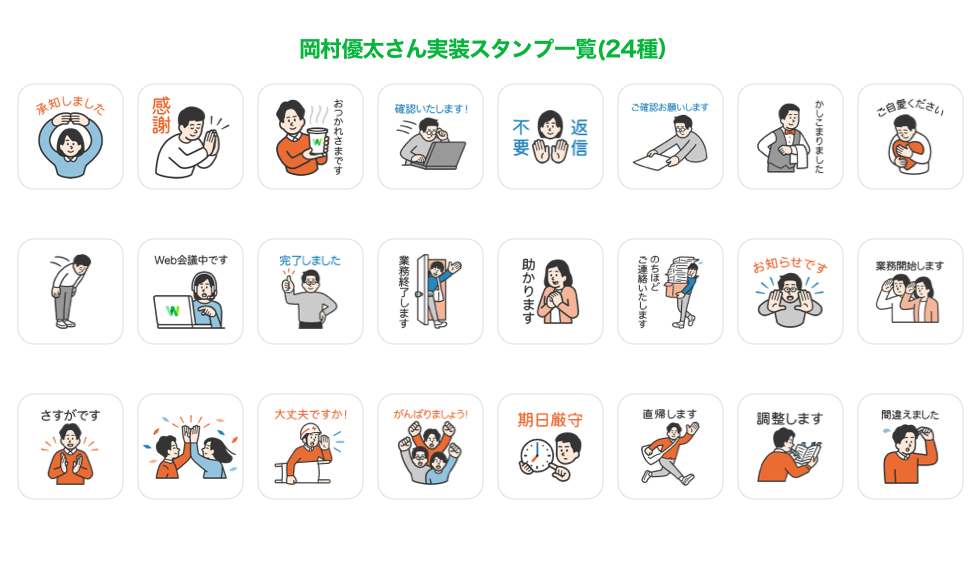また、日頃から仕事でのスタンプに使い慣れている、「LINE WORKS」の啓発・広報活動を行う「LINE WORKSアンバサダー」※1 の方々からもスタンプを選出いただいています。