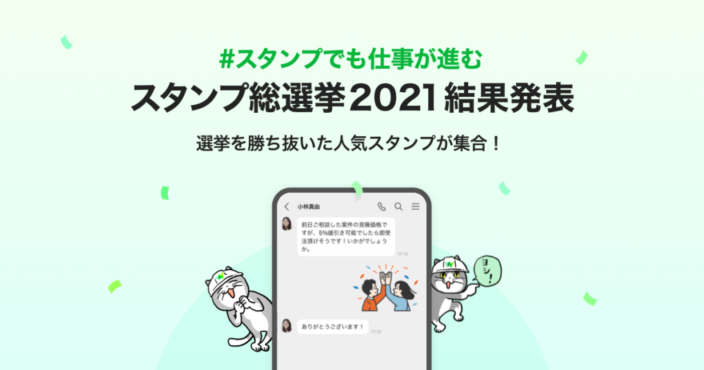 本年度は、新型コロナウイルス感染症拡大の影響で、働く人どうしが会って会話をする機会が減少し、オンラインでの会話が中心になり、コミュニケーションのカタチが大きく変化した1年でした。2020年11月にスタンプフレーズのリクエストを募集した際には、「テキストでは堅い印象になってしまうがスタンプなら柔らかく伝わる」といった文字だけのコミュニケーションでは伝わらないニュアンスをスタンプに期待する声を多く頂戴いたしました。ビジネスシーンでも気軽にスタンプを利用していただき、気持ちが伝わるコミュニケーションの一助になることを願っています。