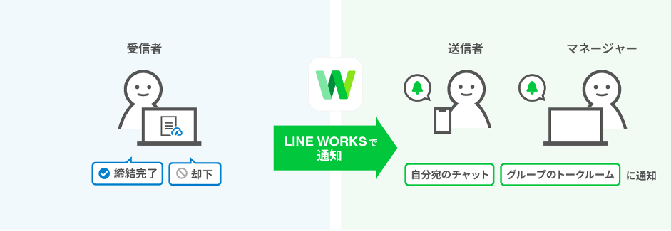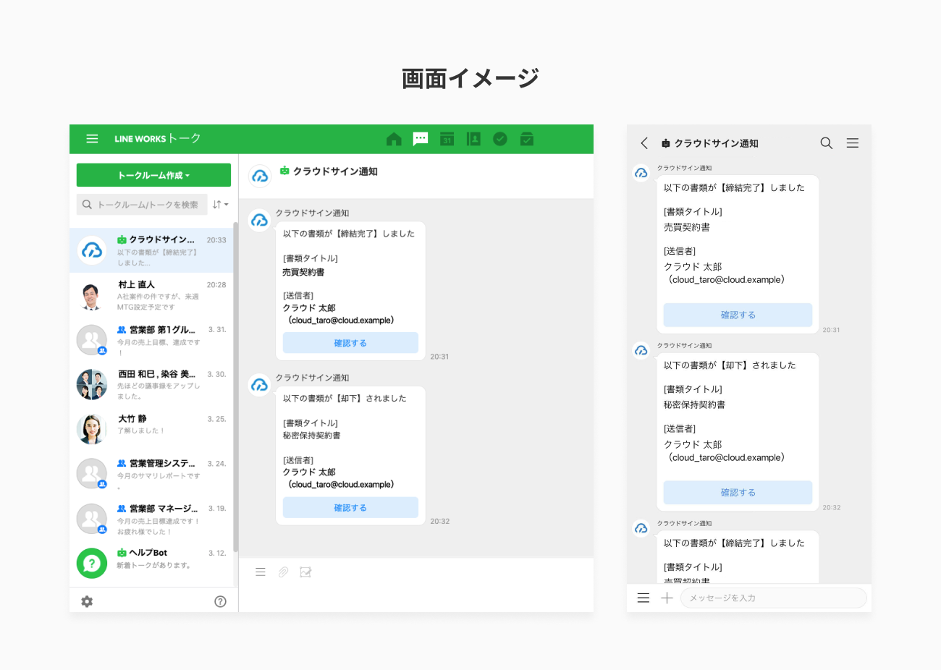 このたび提供を開始する連携機能では、クラウドサインによる契約締結ステータスの通知をLINE WORKS上で受け取ることができます。契約締結完了・却下のステータスは、LINE WORKSの「トーク」で通知されるため、契約の進捗状況および情報の一元管理が可能になります。