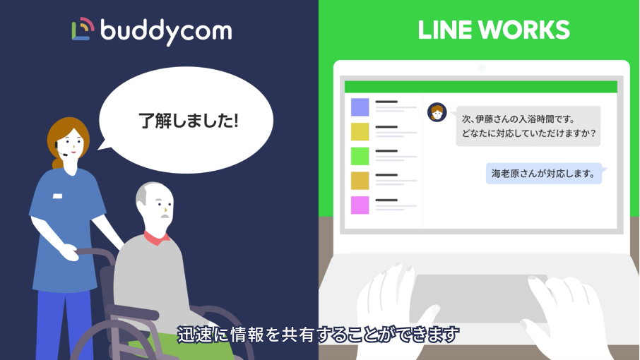 「LINE WORKS」で入力したテキストを「Buddycom」が自動で音声化して読み上げ