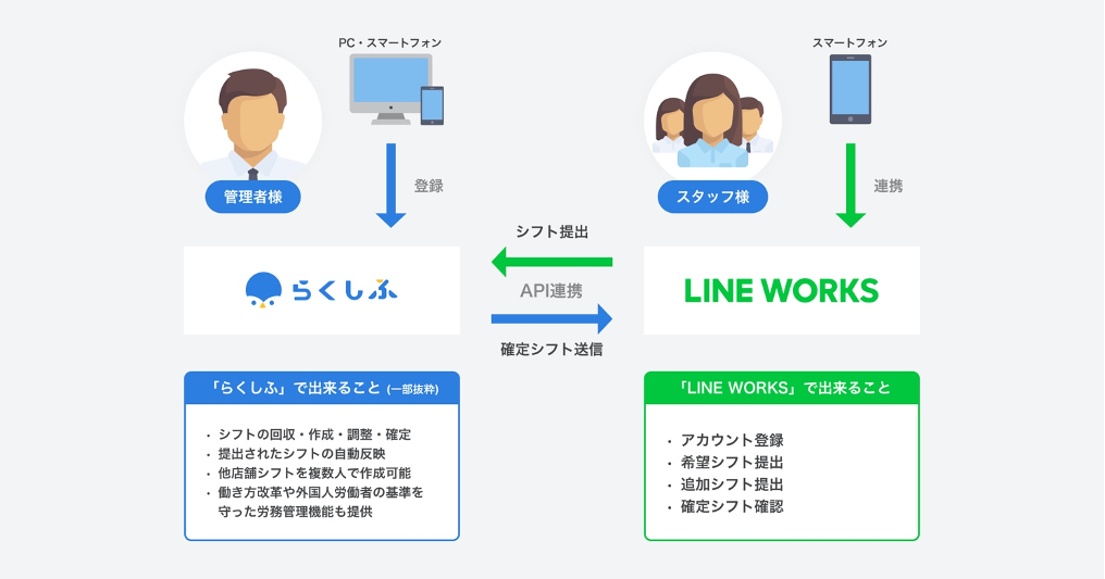 ビジネス現場のコミュニケーションツール「LINE WORKS」を提供するワークスモバイルジャパン株式会社(本社:東京都渋谷区、代表取締役社長:福山 耕介、以下 ワークスモバイルジャパン)は、株式会社クロスビット(本社:東京都品川区、代表取締役:小久保 孝咲、以下 クロスビット)が提供するシフト管理SaaS「らくしふ」と「LINE WORKS」の連携機能を提供開始したことをお知らせいたします。本連携により、「LINE WORKS」上でシフトに関するコミュニケーションが可能になります。また、クロスビットと共催で導入企業向けのセミナーを実施いたします。