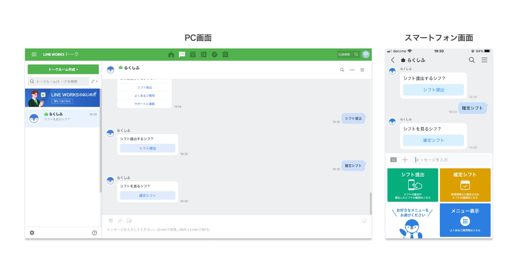 LINE WORKSは「使いやすさ」「汎用さ」「セキュリティ」といった観点からビジネスチャットとして完成度が高く、らくしふ導入企業においても広く採用されていました。この度のプロダクト連携により、LINE WORKS上でのビジネスコミュニケーションと並行し、シームレスにシフト関連業務(通知の受取・シフト提出・確定シフトの確認)を行えるようになりました。