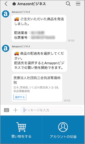 左:「LINE WORKS」上でのAmazonビジネスによる購入開始画面