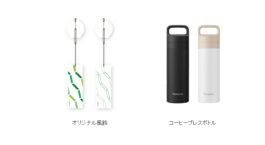 本キャンペーンにご応募いただいた方の中から先着で2,000名に「オリジナル風鈴」を、抽選で21名に「コーヒープレスボトル」をプレゼントいたします。