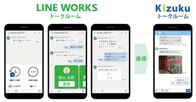 ②「Kizuku」側に作成された対象担当者とのトークルームより「LINE WORKS」へメッセージや写真の送付