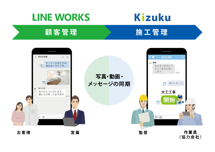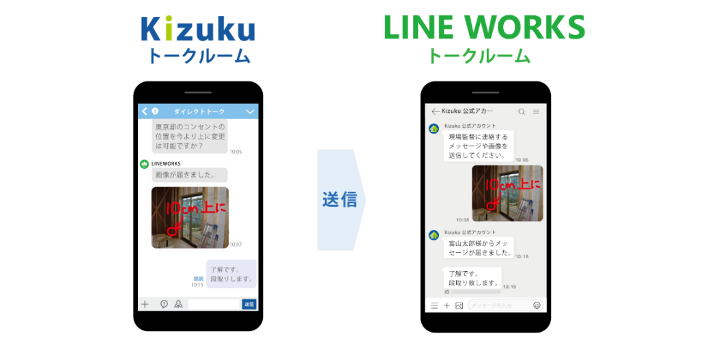 本連携により、「LINE WORKS」のトーク画面上で入力したテキスト、写真、動画等を「Kizuku」上で確認することができ、「Kizuku」のトークルームから「LINE WORKS」へのテキストや写真、動画等の送信も可能になります。両アプリの切り替えなしに情報共有が可能となるため、「LINE WORKS」を利用している顧客や営業担当者が、「Kizuku」を利用している施工現場にスピーディーに情報共有することができ、建設現場・営業現場間のコミュニケーションをさらに効率化することができます。