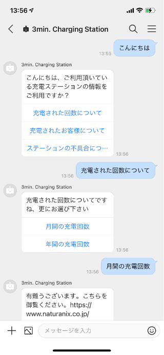 この度の取り組みでは、ナチュラニクスが提供する充電ステーションの管理者向けインターフェースとして「LINE WORKS」を活用し、チャット(トーク)を送信するだけで、充電ステーションの利用状況やバッテリー残量、メンテナンス状況等をスマートフォン上でスムーズに確認できるようになります。また、今後の予定として、充電ステーションの設定作業も「LINE WORKS」上から行う予定です。