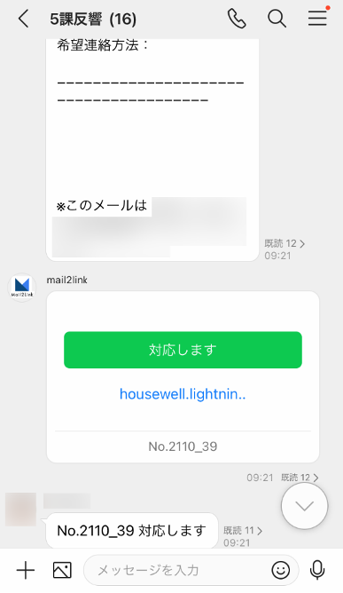 お客さまからの反響についてのお知らせメールが「LINE WORKS」のトークルームに転送され、スタッフが対応