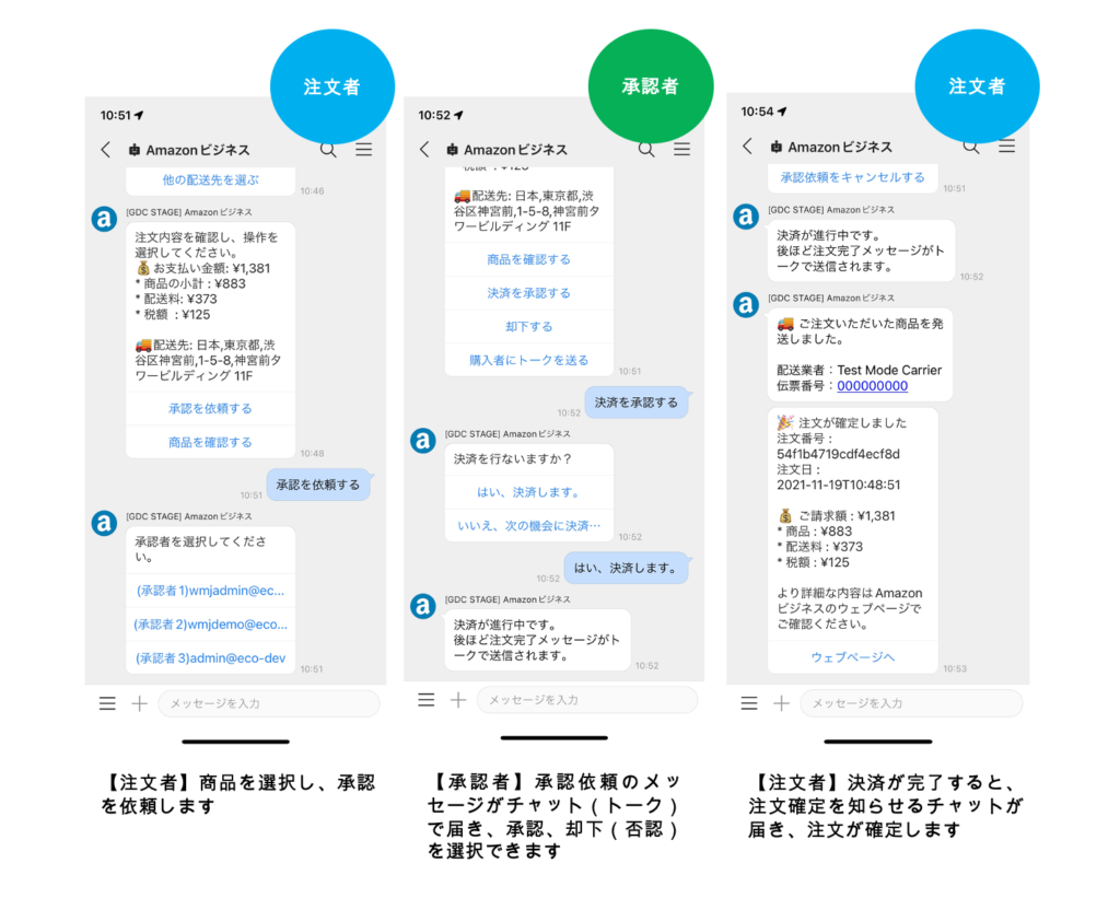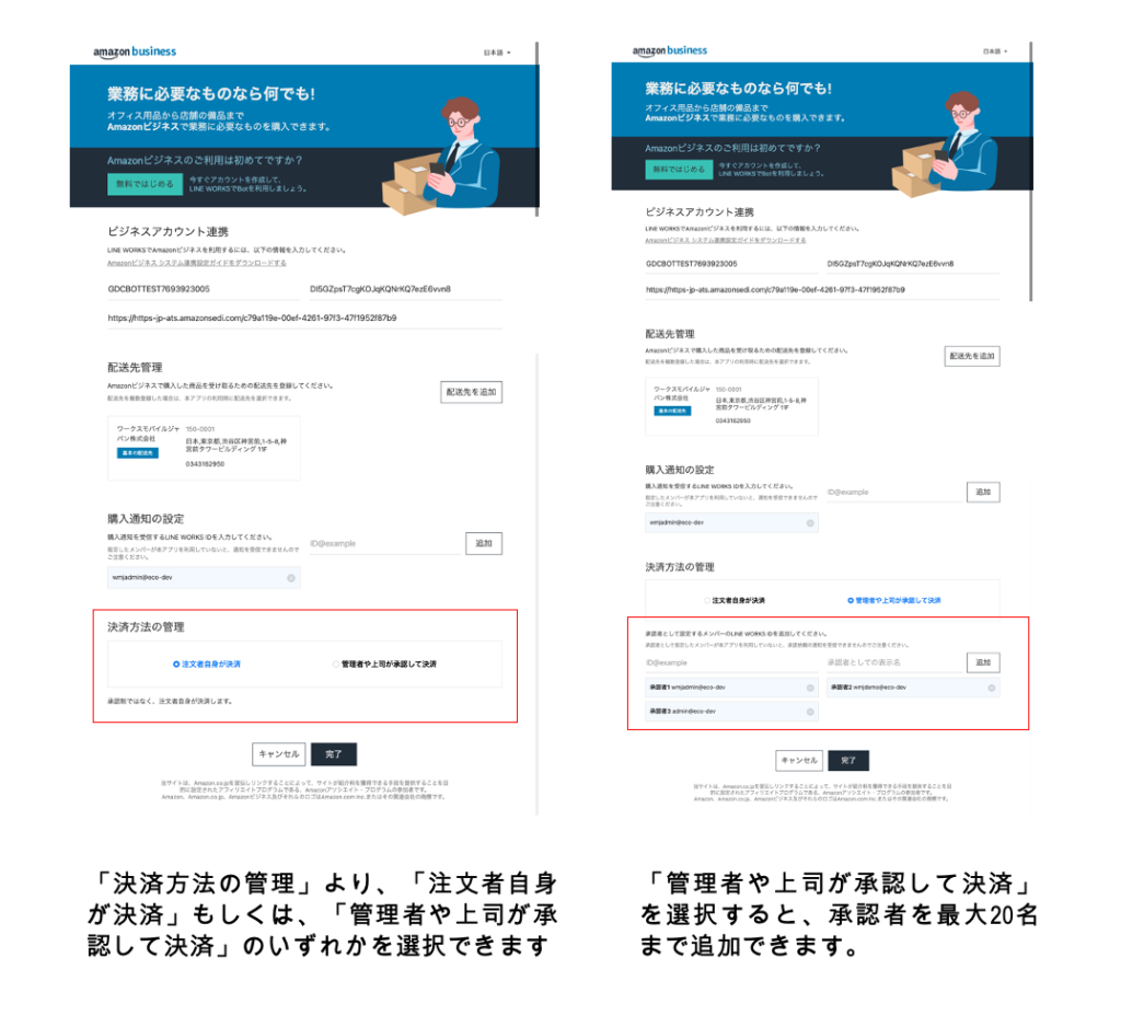 これにより、注文者が「LINE WORKS」経由で「Amazonビジネス」から商品の発注を行った後、承認者が「LINE WORKS」上で購買可否の決裁を行うフローを追加できるようになります。
