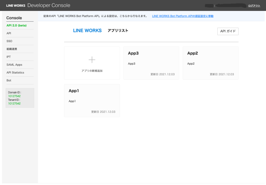 LINE WORKS Developer Console API 2.0 beta:https://developers.worksmobile.com/jp/console/openapi/v2/app/list/view