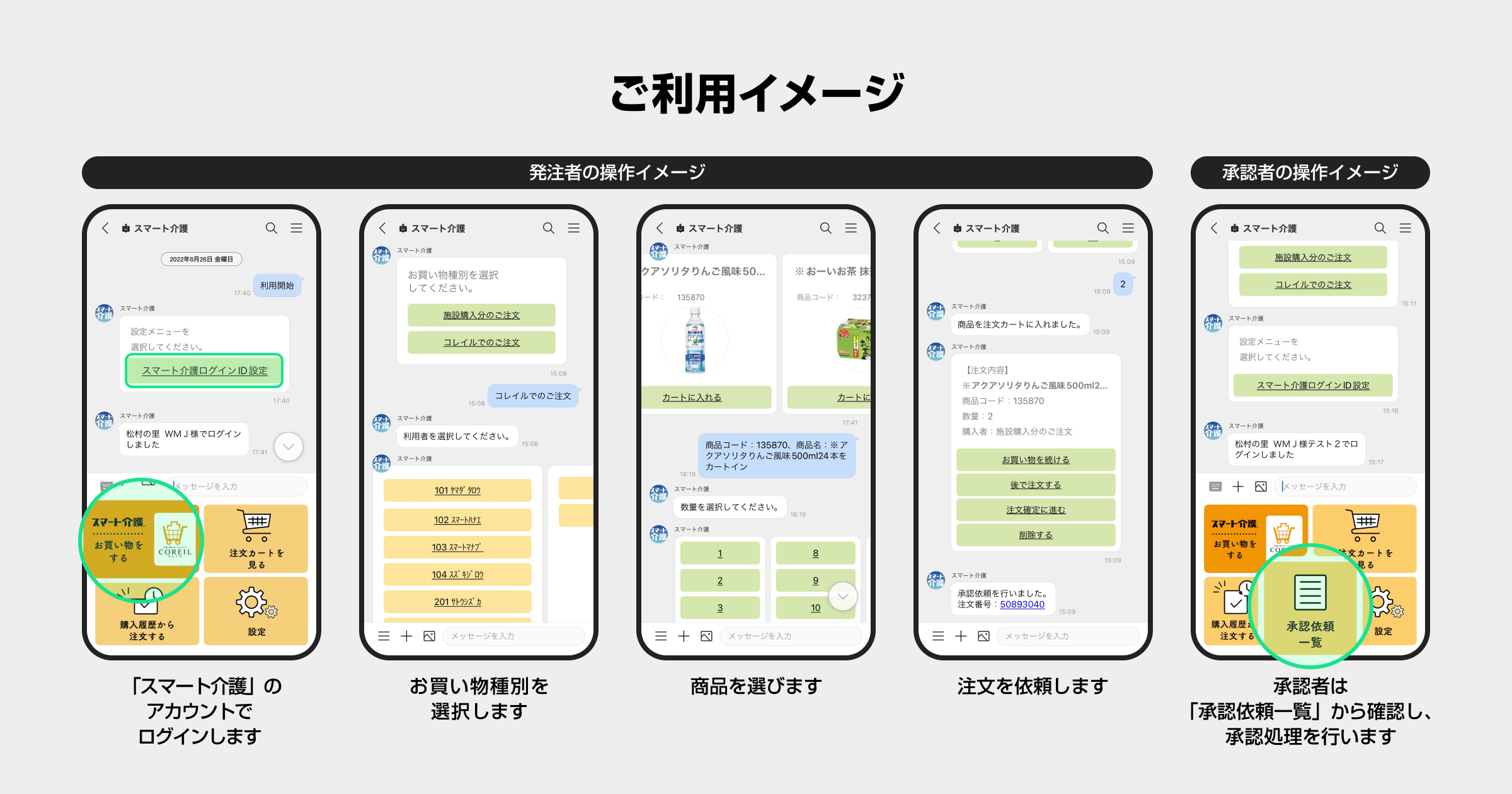 本連携により「スマート介護」が提供する商品を「LINE WORKS」上で注文でき、施設の備品購入や入居者の買い物をスマホひとつで簡単に行うことが可能になります。