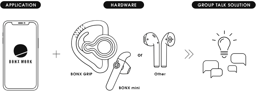株式会社 BONX は、グループトークソリューション「BONX WORK」と専用イヤフォンである「BONX Grip」「BONX mini」「BONX BOOST (2022年発売予定)」を通じて、現場で働く方々である「デスクレスワーカー」に最適なチームコミュニケーションを提供しております。