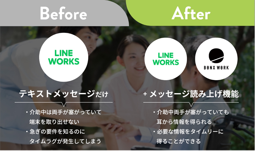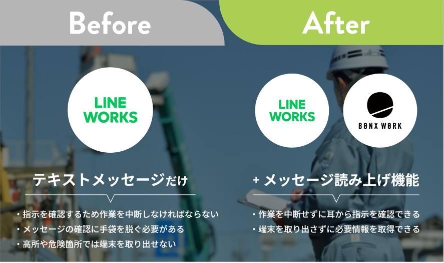 BONXでは2017年より法人向けにサービス提供を開始し、現場で働く「デスクレスワーカー」に最適なチームコミュニケーションを提供してまいりました。BONX WORKの提供を進める中で、LINE WORKSを併用されている方々が非常に多くおり、機能連携に対するリクエストもいただくようになりました。本件について両社で協議を進める中で、「現場のコミュニケーションツールはデスクレスワーカーのチームワークの向上に無くてはならないツールであり、テキストと音声を組み合わせることでより付加価値が増えるのでは」という考えに至りました。このような背景から今回、機能連携をリリースさせていただくこととなりました。