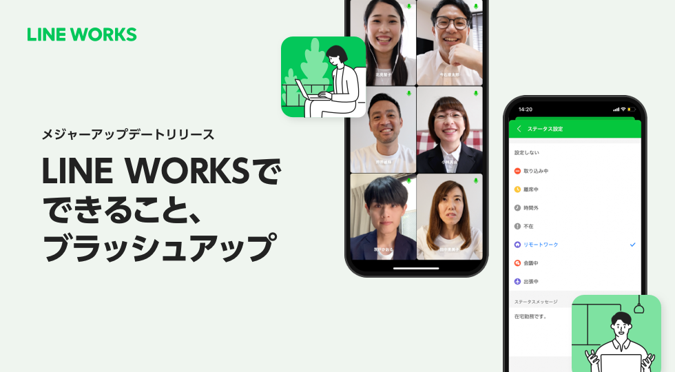 今回のメジャーアップデートでは、「LINE WORKSでできること、ブラッシュアップ」をコンセプトに、利用がますます広がっているビデオ通話機能の強化や、企業や団体などはたらく組織に合わせて自分の勤務状態などを表示できる「ステータス」のカスタマイズ、アンケート機能の改善など、より使いやすく多様な働きかたを後押しする機能追加および改善を行ないました。