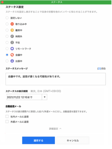 1.多様化する働き方をサポート:ステータスのカスタム機能と自動応答メッセージの適用範囲の拡張で、はたらく仲間の状況もすぐに把握