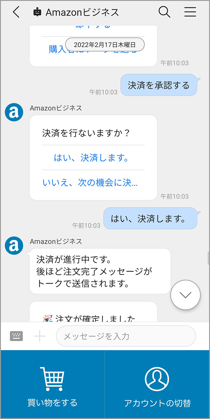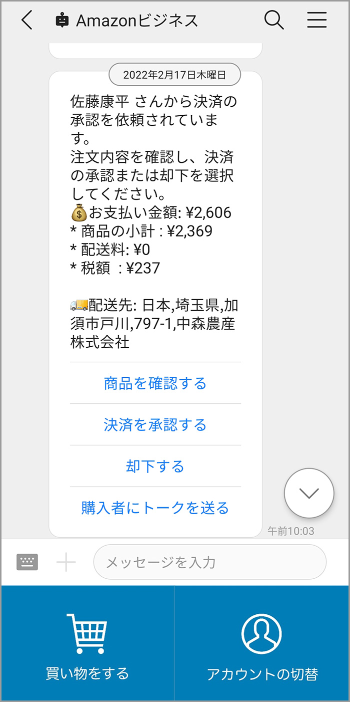 承認者側のAmazonビジネスのトーク画面