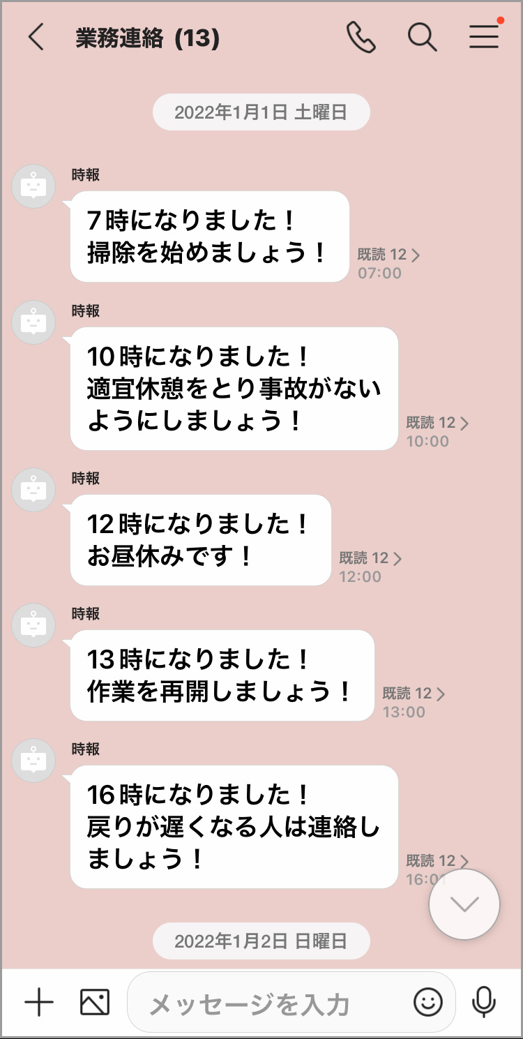 また、農作業中に発生する事故への注意喚起や安否確認のため、「LINE WORKS」のAPIで「時報Bot」を作成。定時になると「休憩を取りましょう」といったメッセージを全従業員に自動送信しています。メッセージの未読既読を管理者が確認することで、スタッフの安否確認にもつながっています。