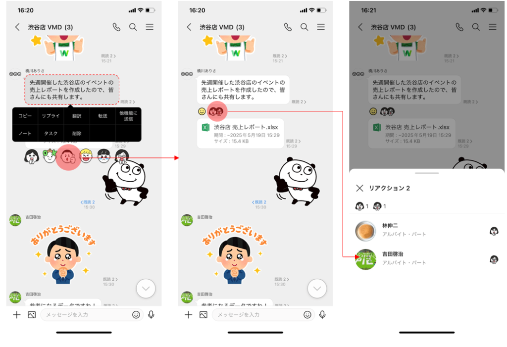 今回のアップデートから、トーク上で任意のメッセージや画像、スタンプなどにピンポイントで反応することができるリアクション機能が追加されます。メッセージの長押しで表示される全6種類のアイコンからお好みの表情を選択でき、既読機能と同様に、誰がどのリアクションを送ったのかもリストから確認可能です。