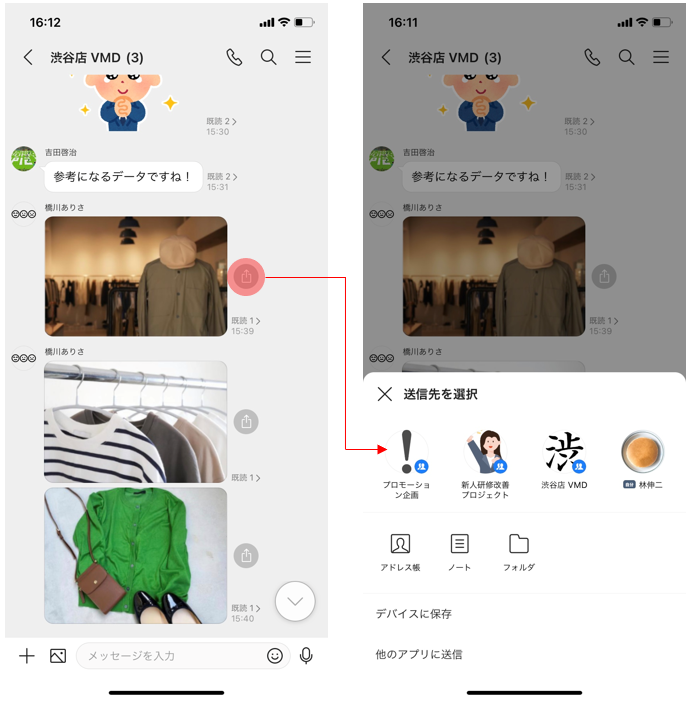 「LINE WORKS」上で画像やファイルの共有/転送などを行う際に、トーク、ノート、Driveといった各種サービスやコンテンツによって操作のステップや導線が異なっており、送信するまでの操作ステップが多く、覚えにくかったり、煩雑に感じられたりするケースがありました。今回のアップデートではこのような課題を解決するためにサービス間のコンテンツ転送時に共通のボトムシートを適用し、ユーザー体験に一貫性を持たせました。