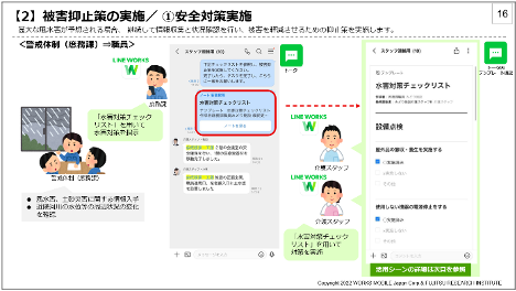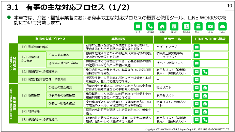 本ガイドラインは、厚生労働省が発行する「介護施設・事業所における業務継続ガイドライン等」をベースに、株式会社富士通総研(本社:東京都大田区、代表取締役社長:石塚 康成、以下 富士通総研)が保有する3,000社を超える事業継続コンサルティングの実績や知見を加えたテンプレートを用意し、介護・福祉事業者が必要な対応及び情報共有を継続的に行うために、日頃使い慣れているLINEと同様の操作性を持つ「LINE WORKS」を用いて有事対応の中で活用できるシーンとその方法をガイドラインとして記載しています。