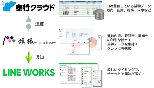 「奉行クラウド」に蓄積される各種データから、旗振~hata free~が職種別に必要な情報を生成し、「LINE WORKS」を通じて各担当者に通知します。