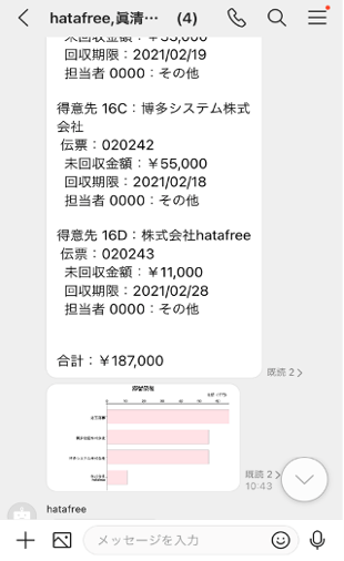 右:「旗振~hata free~」を通じた「LINE WORKS」へのデータ通知イメージ(「滞留債権」通知により、入金が遅れている得意先が一覧で通知されます。これにより担当者に気付きを与え、すぐに連絡をすることができるため、キャッシュフローの健全化に繋がります。)