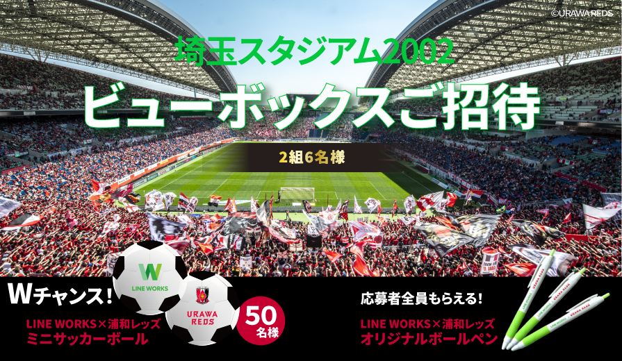 本キャンペーンは、これから「LINE WORKS」無料版(フリープラン)を利用開始するお客様を対象に実施いたします。期間中に専用フォームからエントリーいただいた企業や団体に、浦和レッズとコラボレーションしたオリジナルボールペンをプレゼントするほか、さらに抽選で、埼玉スタジアムのビューボックス※1を2組6名様に、LINE WORKSオリジナルサッカーボールを50名様にプレゼントいたします。