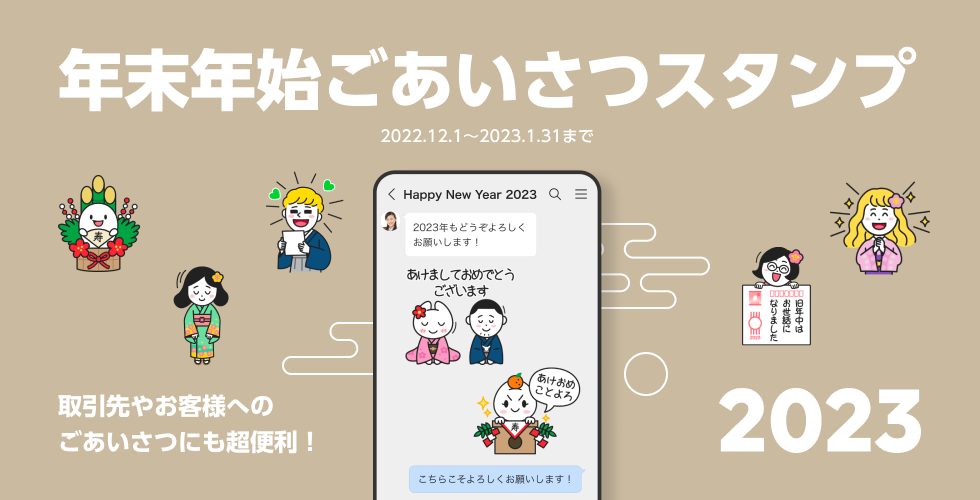 1年の終わり、そして新たな1年の始まりには、節目におけるさまざまなコミュニケーションが行われます。仕事上でも、仲間と挨拶を交わしたり、上司や部下、取引先やビジネスパートナーに日頃の感謝を伝えたりする機会も多くなります。この度「LINE WORKS」は、そのような年末年始のやりとりをよりあたたかく、円滑に進める手助けをすべく、期間限定の「年末年始ごあいさつスタンプ」を制作しました。