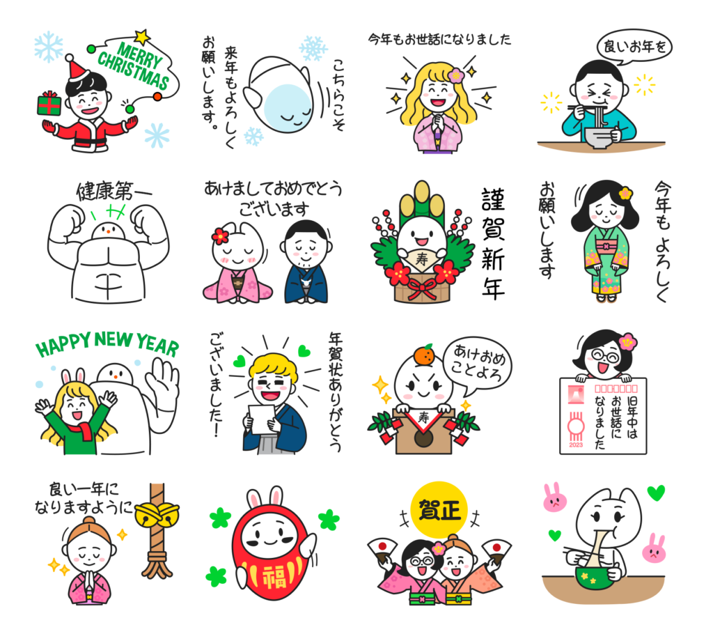 スタンプの内容:年末年始の挨拶ややりとりに利用できるスタンプ全16種類