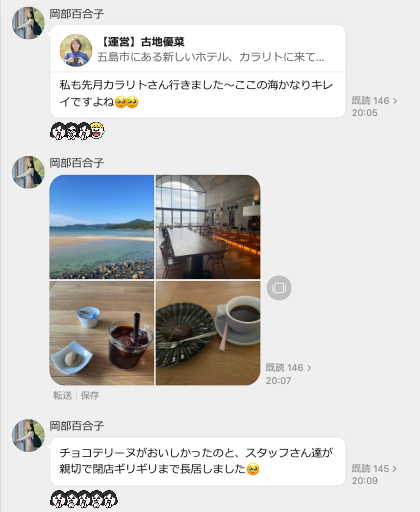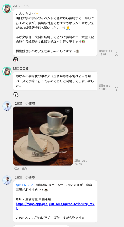 画像:「長崎友輪家」による「LINE WORKS」トーク画面で実際に行われているやりとり。宿泊施設や街の風景、コミュニティの会合についてなど、内容は多岐にわたる。