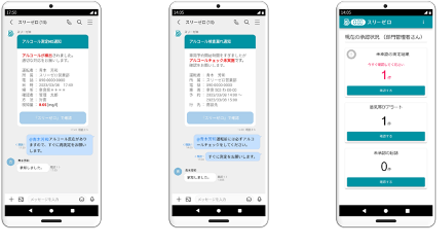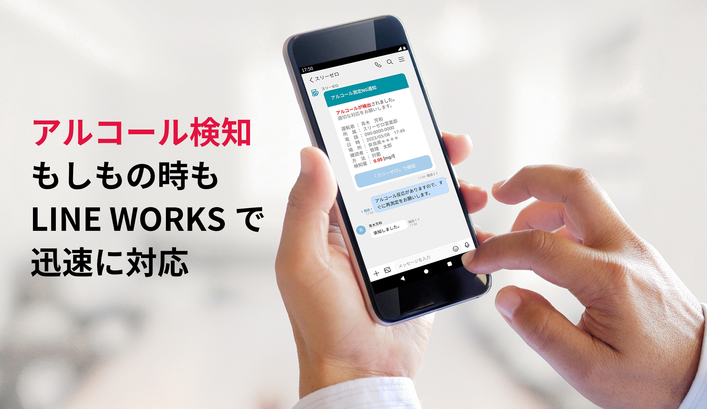 昨年4月の道路交通法施行規則の改正により、白ナンバー事業者においても酒気帯び有無の確認が義務化されて一年が経とうとしています。その間、ご利用いただいている方々から、「業務補助者が確認を行ったアルコールチェック記録について、安全運転管理者が最終確認できる機能がほしい」「測定結果の数値が4桁で表示されるアルコール検知器にも対応してほしい」などのお声をいただき、アルコールチェック管理の課題解決と効率化のためアップデートを重ねてまいりました。今回、アルコールチェック管理において欠かせない管理者と運転者のコミュニケーションをより便利にするため、「スリーゼロ」とビジネスコミュニケーションツールの「LINE WORKS」が連携します。この連携によって検査時にアルコールが検出された場合など、管理者の方々へより分かりやすく速やかにお伝えでき、迅速な対応が行うことができるようになります。