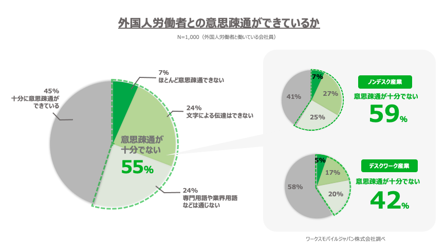 1.外国人労働者とのコミュニケーションにおいて、55%が「意思疎通が十分でない」と回答