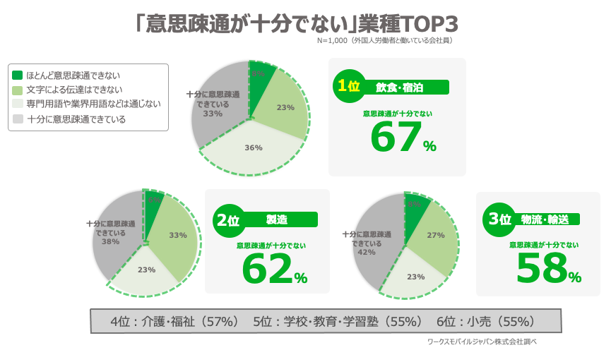 中でも、店舗・工場・現場系(以下、ノンデスク産業)においては約6割(59%)が意思疎通に問題を抱えると回答。「意思疎通が十分でない」業種TOP3 は、1位:飲食・宿泊、2位:製造、3位:物流・輸送とノンデスク産業が上位を占める。